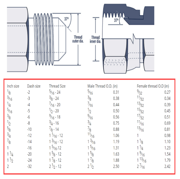 Fitting jenis ini menggunakan standar ulir UNF dengan sudut flare 37 derajat. “37°” menunjukkan bahwa sudut permukaan penyegelan fitting adalah 37 derajat. Segel terjadi pada permukaan flare logam ke logam. JIC sangat populer di industri alat berat Amerika karena kemampuannya menahan getaran dengan baik. Namun, instalasi memerlukan torsi yang tepat agar tidak retak.